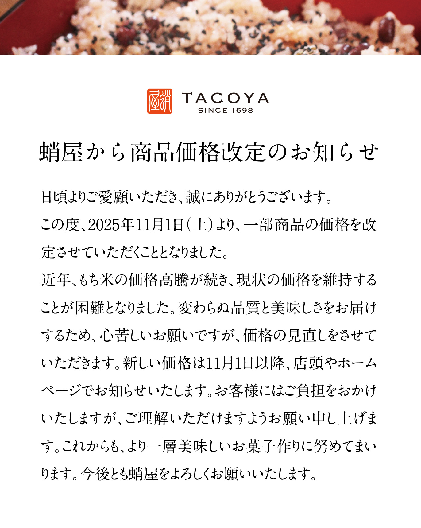 商品価格改定についてのお知らせ